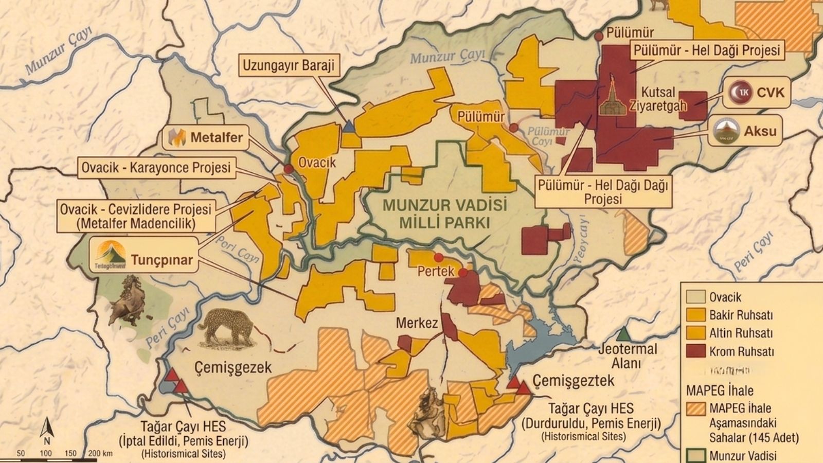 Munzur Vadisi çevresinde planlanan bazı krom sahalarının ise milli park sınırlarına yakınlığı nedeniyle yargı süreçlerinin devam ettiği ifade ediliyor.