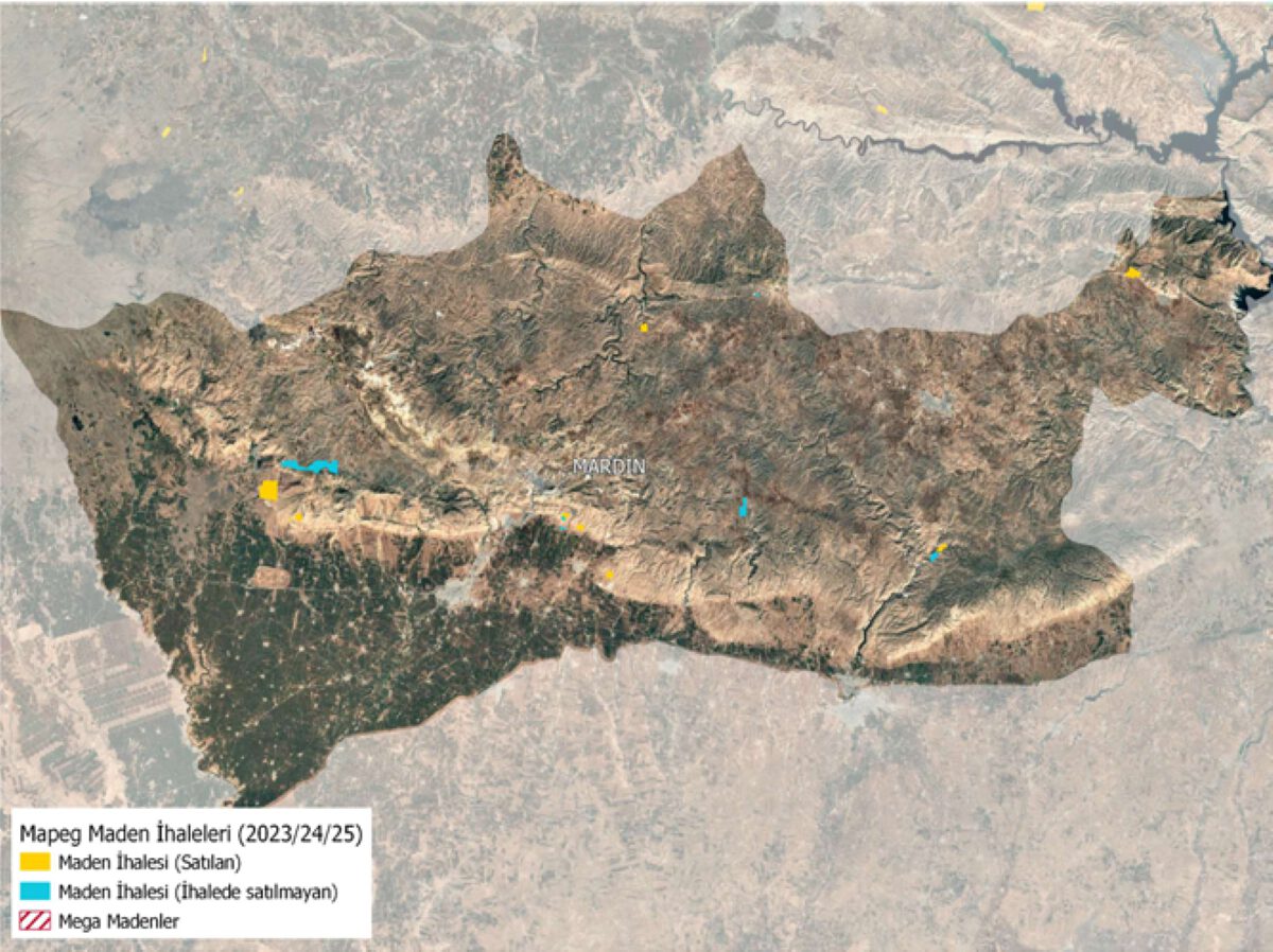 Maden ve Petrol İşleri Genel Müdürlüğü (MAPEG), 2023 yılı başından 2025 yılı sonuna kadar açtığı maden ihalelerinde Mardin’de toplam 17 ayrı ruhsat sahasını satılığa çıkardı. Bunlardan 9 adet ruhsat sahasının maden şirketlerine satışını gerçekleştirdi. İhalelerde satılığa çıkarılan ruhsat sahalarının toplam alanı 2.513 hektar (3.520 futbol sahası genişliğinde). Satılan ruhsat alanlarının toplam alanı ise 1.312 hektardır (1.838 futbol sahası genişliğinde).