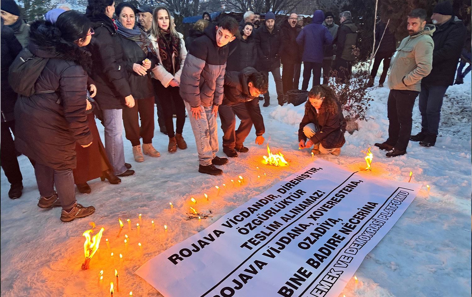 Basın açıklamasının ardından yurttaşlar, Rojava’daki saldırılarda yaşamını yitirenler anısına mumlar yakarak saygı duruşunda bulundu. Etkinlik, Rojava halkıyla dayanışma mesajlarıyla sona erdi.